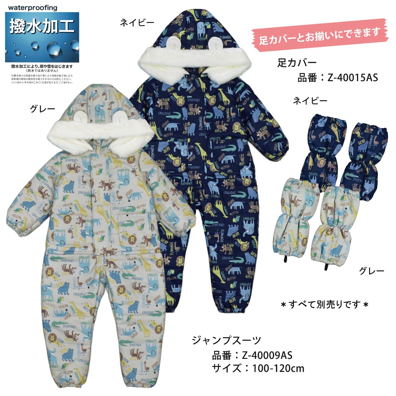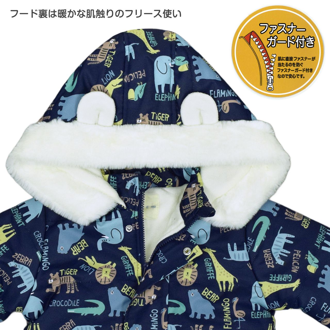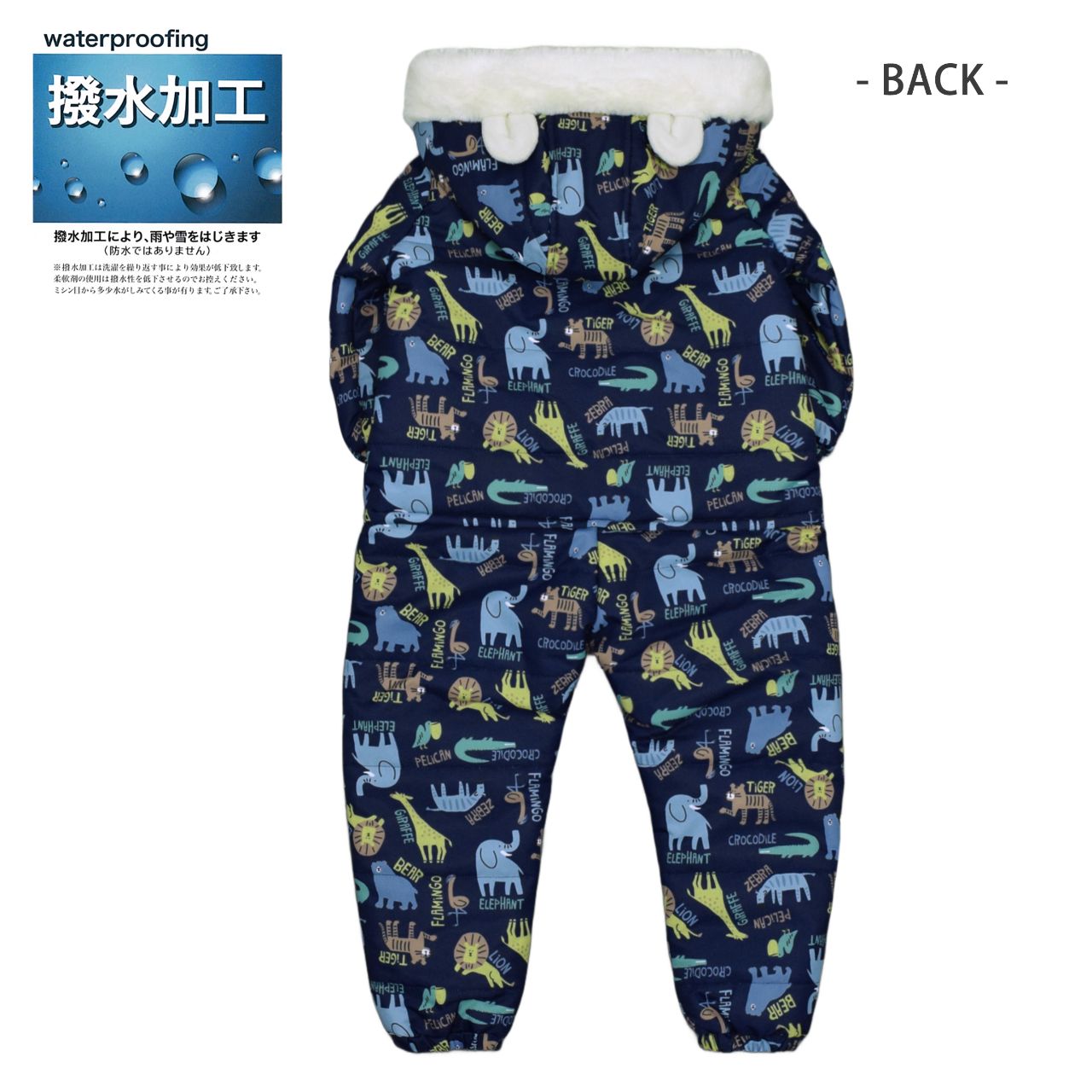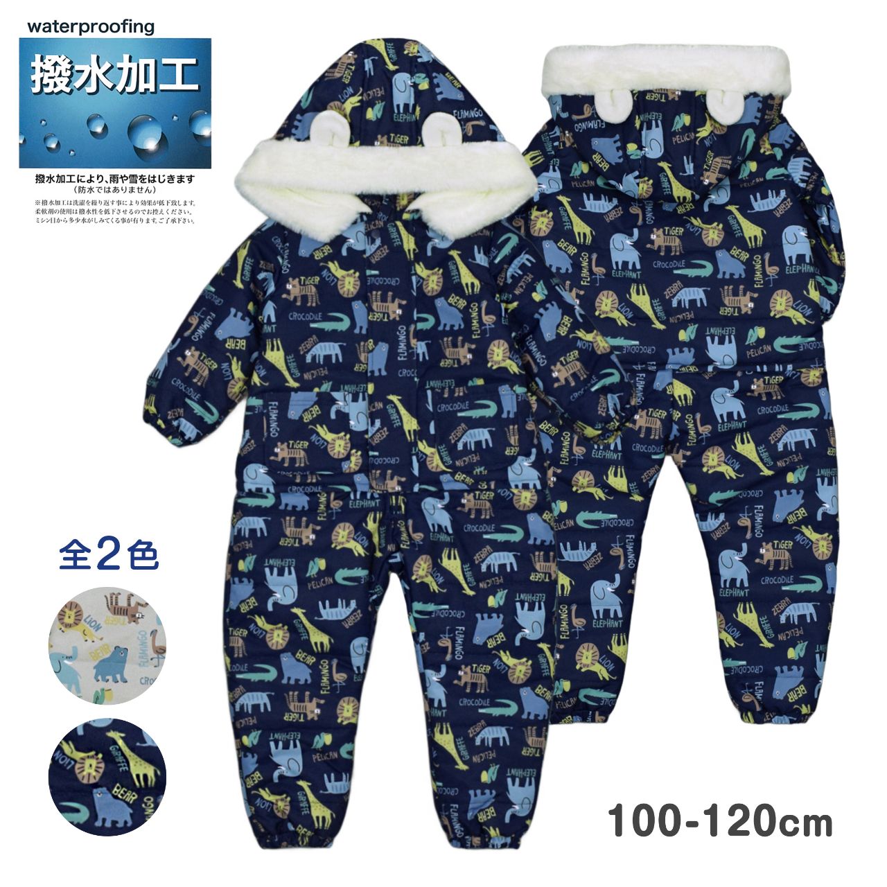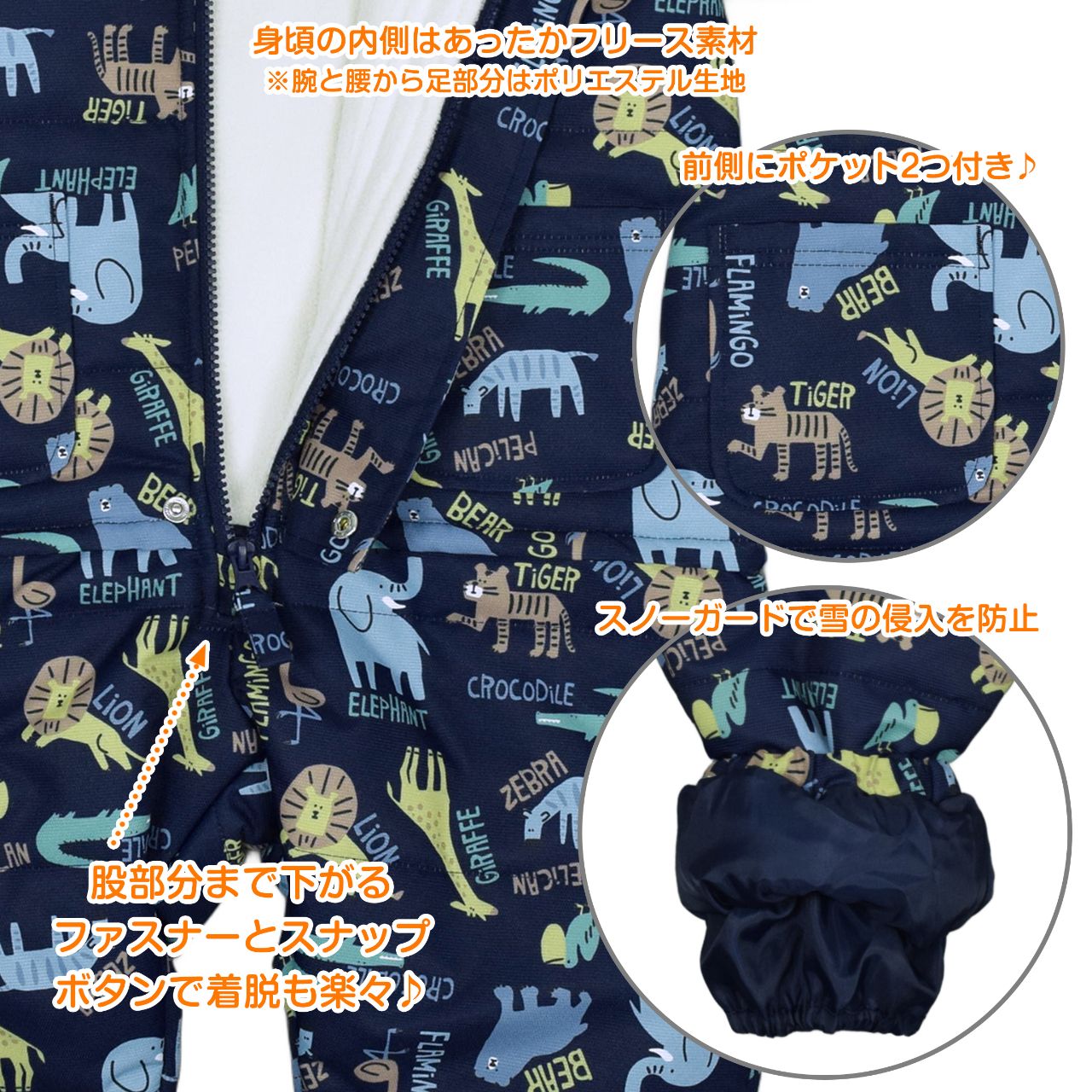 ☆ 商 品 説 明 ☆ はっ水加工 中綿入り アニマル 総柄 ジャンプスーツ。 ライオン シマウマ ワニ キリン トラ 象 プリントが かわいい スノーコンビです。 フード裏、身頃は暖かな肌触りのフリース使い。袖、腰からパンツ部分にかけては滑りの良いポリエステル使用。着脱が楽にできる股下部分までのファスナー付き。襟部分にゆるめのゴムが入って程よくフィットしてくれます。 フードは柔らかなボアとフリース使いのかわいい耳付き。フード取り外し不可。ファスナーガード あり。ポケットは前2つ。手首・足首ゴム入り。スノーガード あり。お名前タグ付き。 ※柄の出方は個々の商品によってそれぞれ異なります。(お選び頂けません)