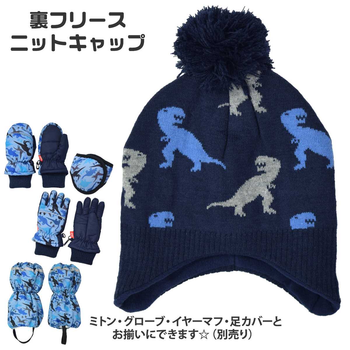 ニットパイロット帽 こども 男の子 裏フリース 耳当て 恐竜柄
